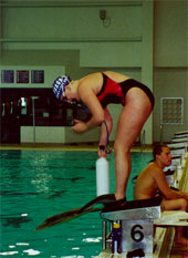 Tekst og foto Lene Axelsen. I Spanien er finne- og apparatsvømning væsentlig mere udbredt end i Danmark, og stævnet havde således deltagelse af i alt 150 svømmere fra 16 spanske klubber og var derfor en oplagt mulighed for at teste formen forud for EM. Stine og jeg har igennem de sidste 2år været medlemmer af klubben "Breca" på Tenerife, hvilket giver os mulighed for at deltage i de spanske mesterskaber. Stævnet tilbyder den nødvendige modstand, der desværre er en mangel vare i Danmark. Første løb var 100m apparatsvømning og her