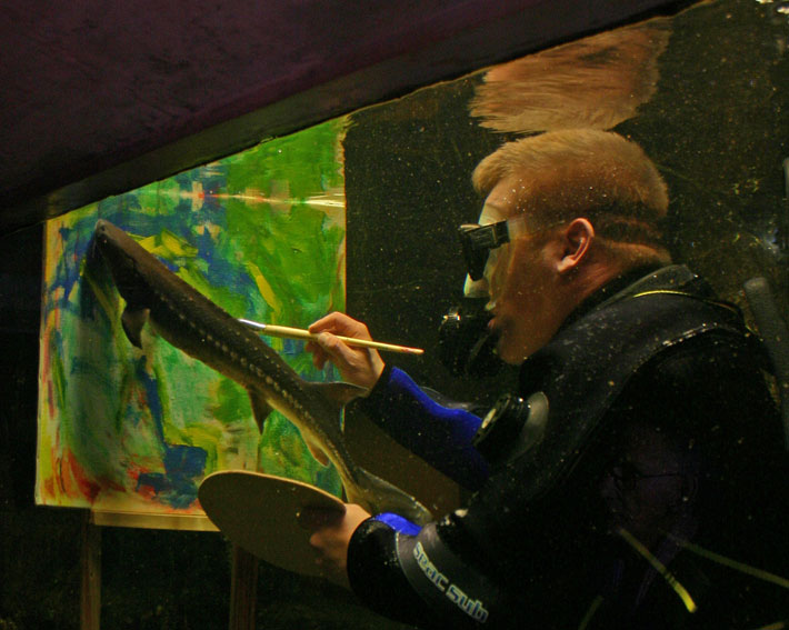 Danmarks Akvarium vender vandet på hovedet. Pressemeddelelse 14-02-2005 Dyrepasserne på Danmarks Akvarium må lægge øre til folks bemærkninger - ofte udbrud som: Men nu kan det være nok!!! I vinterferien i uge 7 & 8 udstiller Danmarks Akvarium publikum - set fra fiskens synsvinkel. Vi vender vandet på hovedet og monterer et kamera inde i et akvarium. Kameraet tager fotos gennem vandet og ruden, hvor resultatet bliver et portræt af dig selv, set inde fra fiskens hjem. Nogle vil nok være glade for, at vi ikke kan høre fiskenes mening om vores udseende!